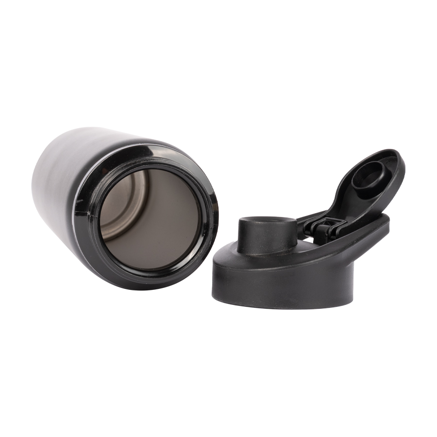 Botella de acero inoxidable SS201 exterior, SS304 interior y tapa rosca metálica. Doble pared térmica. Capacidad de 500 ml. Presentación en bolsa plástica dentro de caja de cartón negra. Acero Inoxidable SS201 exterior y SS304 interior.