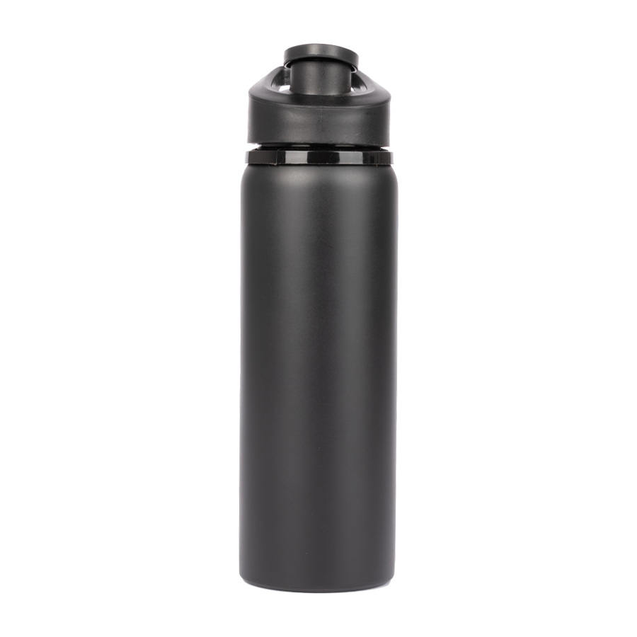 Botella de acero inoxidable con tapa rosca y dosificador. Capacidad de 750ml.Incluye silicona antiderrame. Presentación en caja de cartón negra. Caja de 50 unidades.