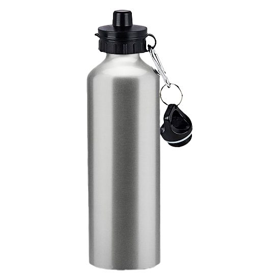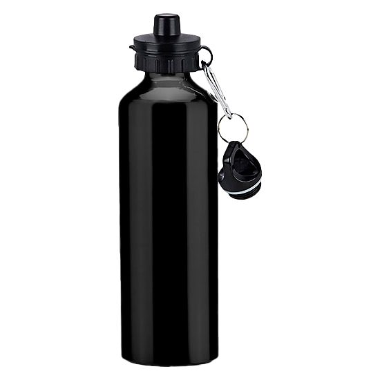 Botella deportiva de aluminio con tapa rosca y gancho mosquetón. Capacidad de 750 ml. Presentación en bolsa plástica dentro de caja de cartón negra.