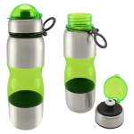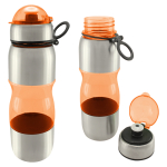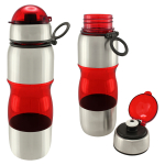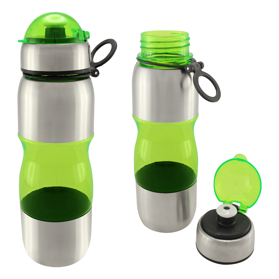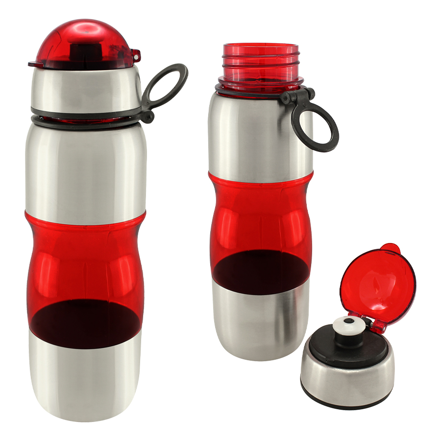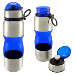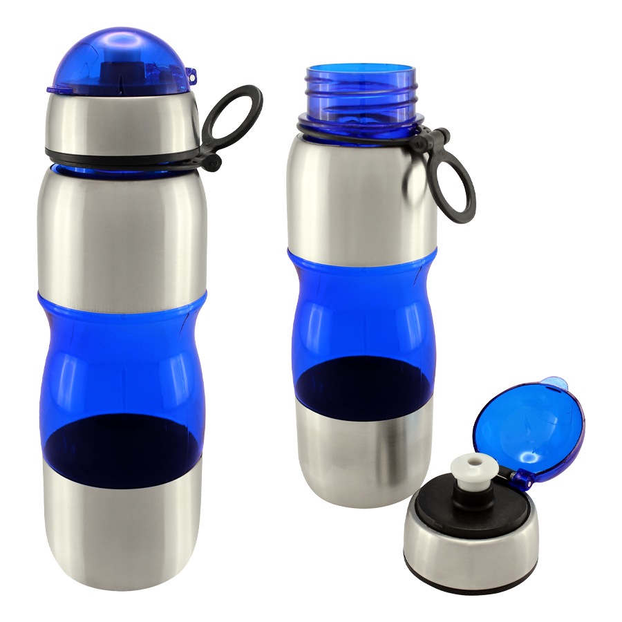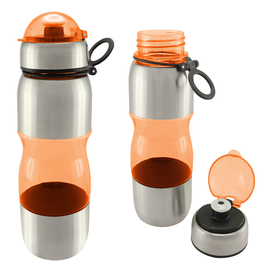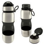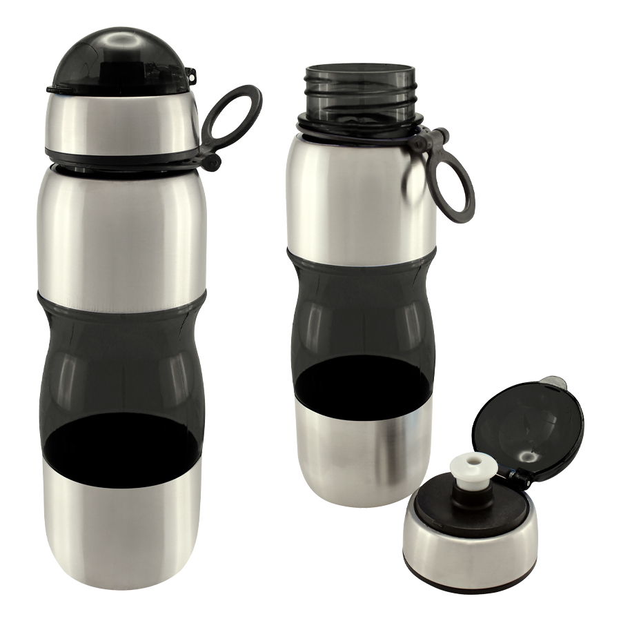 Botella de acero inoxidable con tapa rosca y dosificador. Capacidad de 750ml.Incluye silicona antiderrame. Presentación en caja de cartón negra. Caja de 50 unidades.
