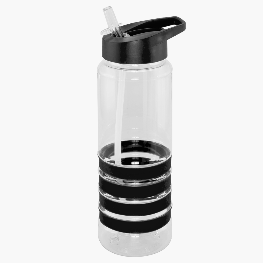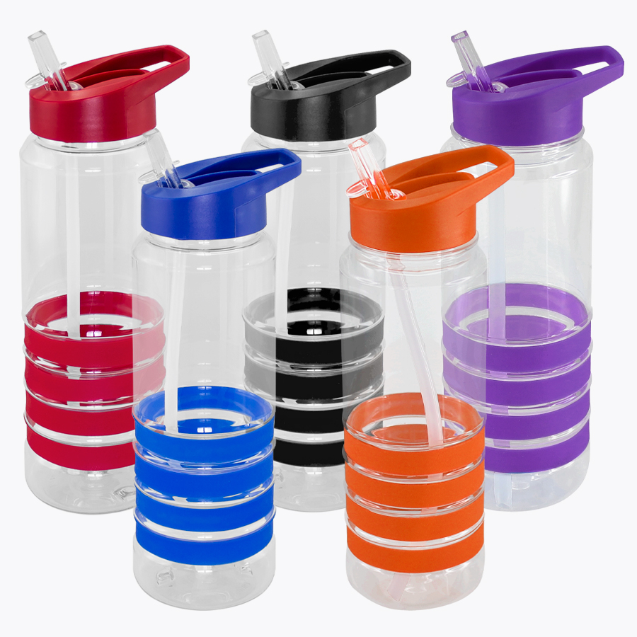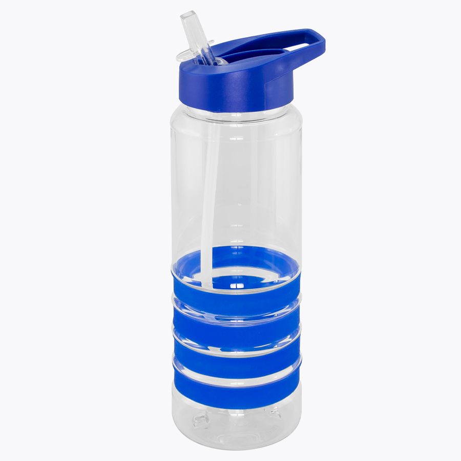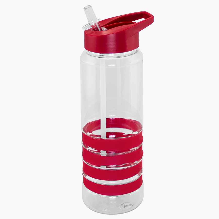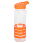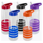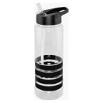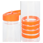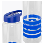 Botella deportiva modelo «Tritan», de plástico rígido traslúcido Tritan con 4 anillos de silicona de color. Tapa de plástico PP de color con bebedero retráctil. Incuye bombilla plástica en el interior. Para líquidos fríos (no térmico).