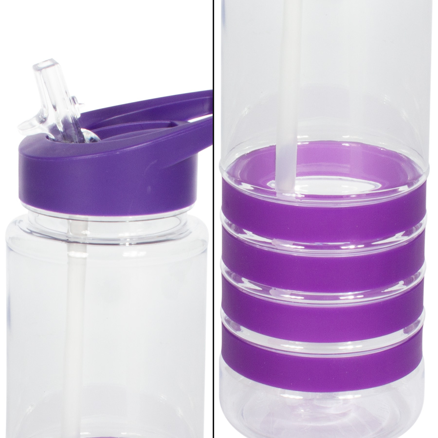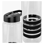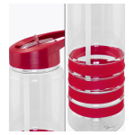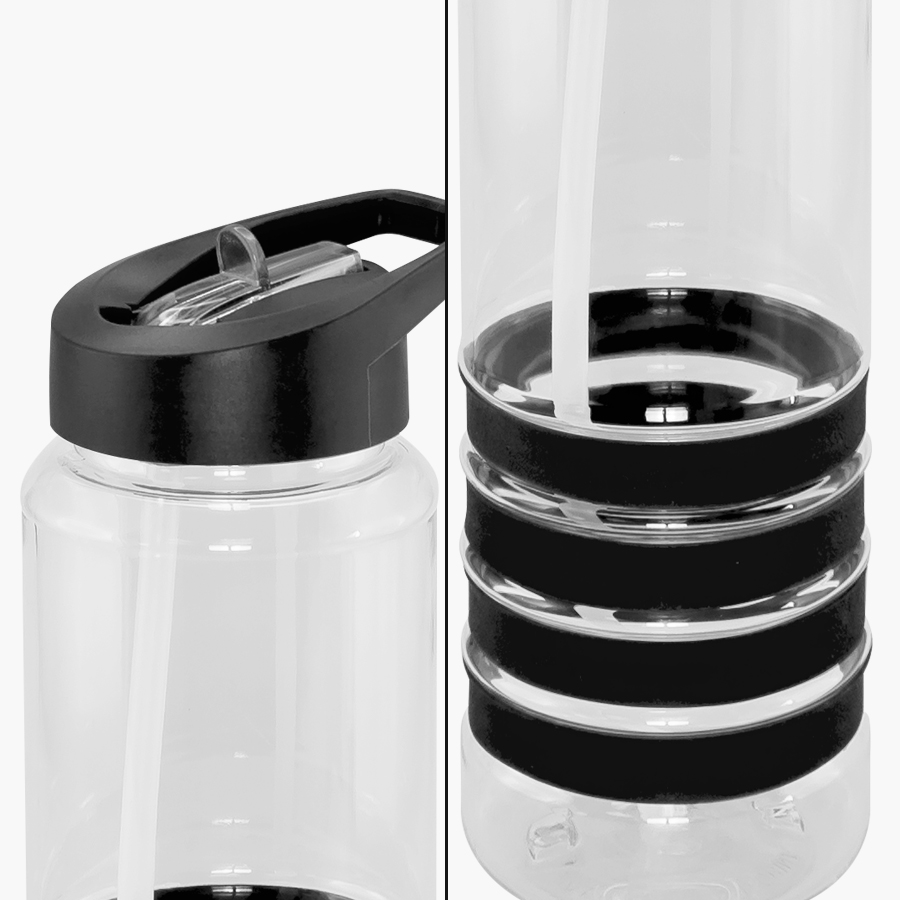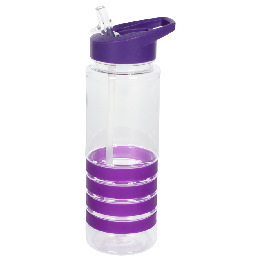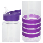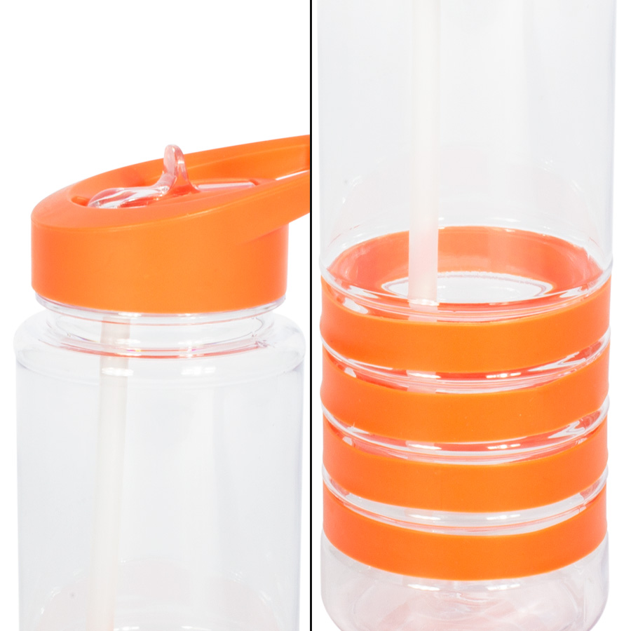 Botella deportiva modelo «Tritan», de plástico rígido traslúcido Tritan con 4 anillos de silicona de color. Tapa de plástico PP de color con bebedero retráctil. Incuye bombilla plástica en el interior. Para líquidos fríos (no térmico).