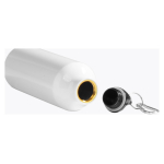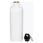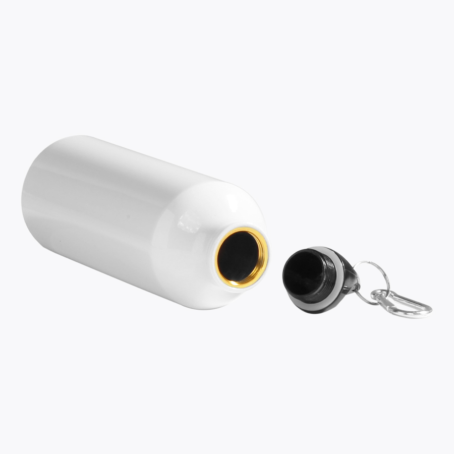 Botella blanca de Aluminio de 750cc. con cobertura para Sublimación. Incluye tapa rosca plástica y mosquetón metálico plateado.D7.3 x 25 cm.