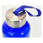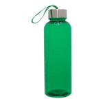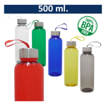 Botella plástica traslúcida en distintos colores con tapa de acero inoxidable y cinta transportable del mismo color de la botella. Capacidad de 500 ml. Presentación en bolsa de regalo plástica con cinta amarre de color. Incluye silicona antiderrame. En bolsa plástica con cinta de color. Libre de BPA.