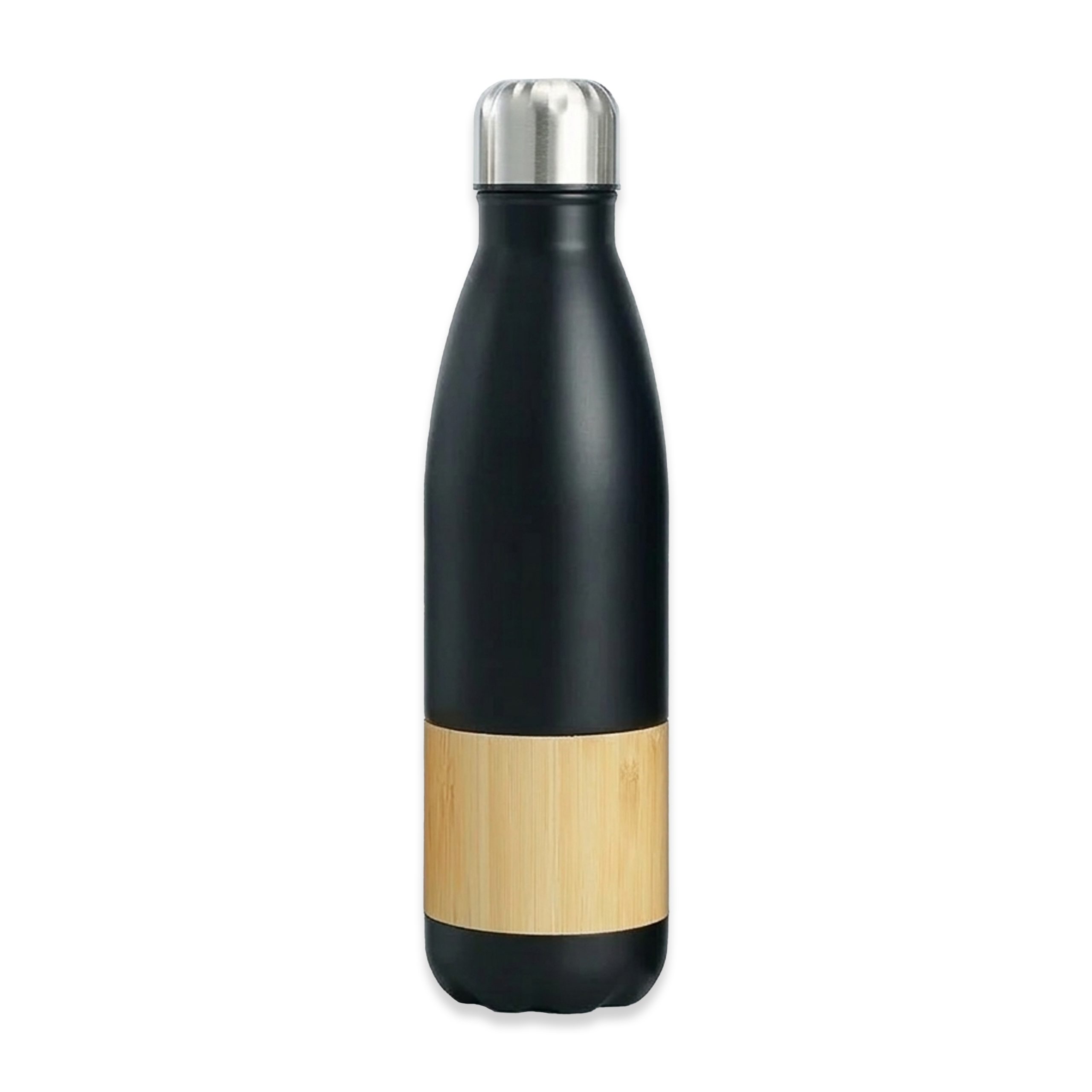 Botella metálica de acero inoxidable con tapa rosca y detalle en inferior de bambu. Presentación en caja individual kraft.