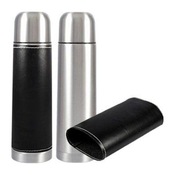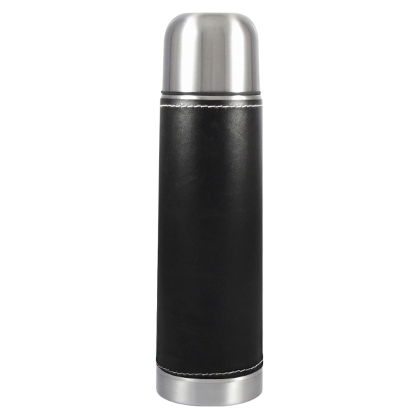 Botella de acero inoxidable SS201 exterior, SS304 interior y tapa rosca metálica. Doble pared térmica. Capacidad de 500 ml. Presentación en bolsa plástica dentro de caja de cartón negra. Acero Inoxidable SS201 exterior y SS304 interior.