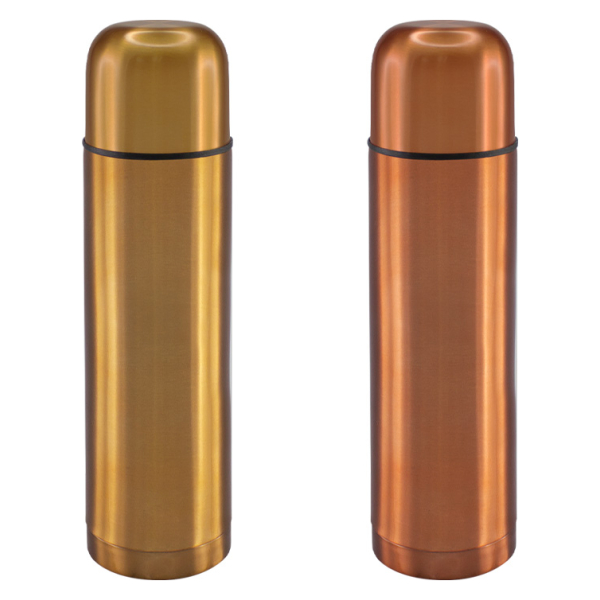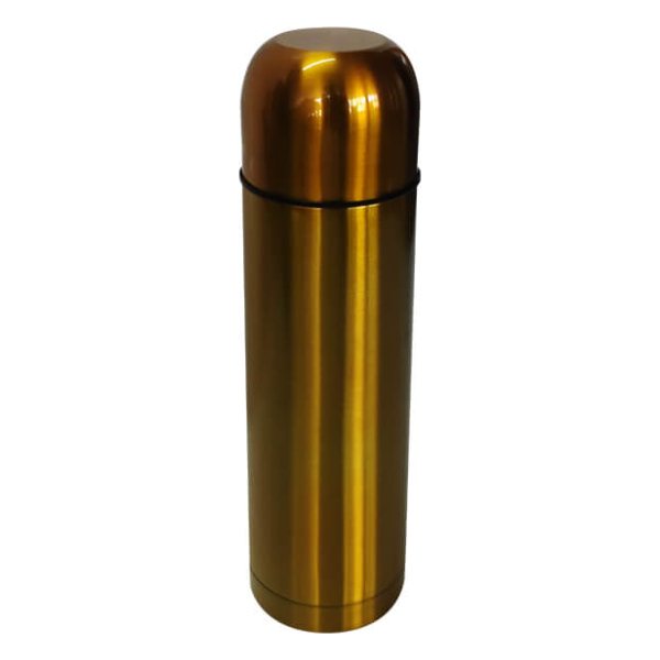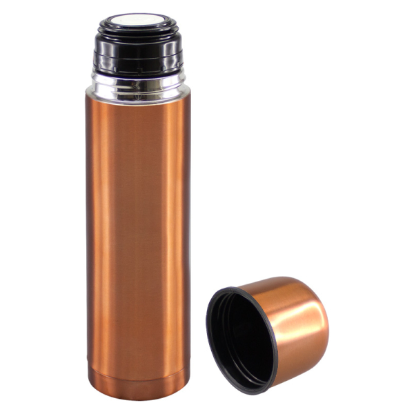 Termo Cobre 500cc Termo metálico encobrizado de 1/2 litro, tapa con dosificador. Presentación en estuche de cartón laminado negro.