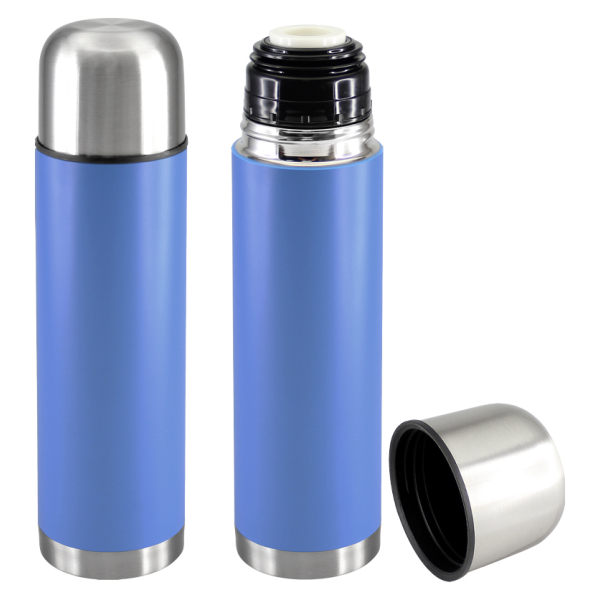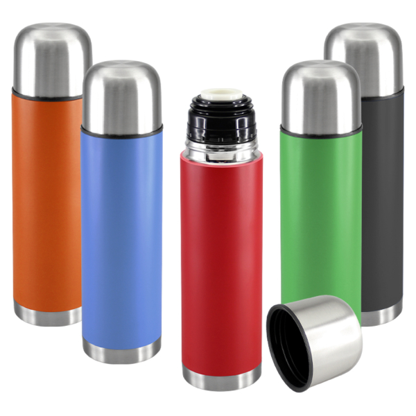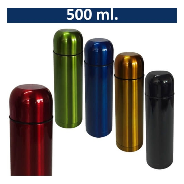 Thermo de acero inoxidable con tapa rosca y dosificador en distintos colores. Capacidad de 500ml. Incluye silicona antiderrame. Presentación en caja de cartón negra. Caja de 24 unidades. Termo para líquidos calientes o fríos. No refrigerar con lácteos o bebidas gaseosas.