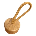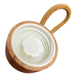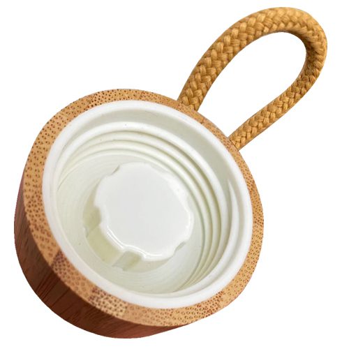 Botella de vidrio con tapa rosca de bambú y cinta de cordón trenzado. Capacidad de 500ml.Incluye silicona antiderrame. Presentación en plástico burbuja dentro de caja de cartón negra. Caja de 40 unidades.