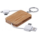 Multicargador tipo llavero de bamboo, diseño compacto. Ofrece conexiones versátiles, incluyendo Tipo C tanto para entrada como para salida además de una doble conexión micro USB-Lightning. Cable habilitado para tanto carga de batería como para sincronización con computador y transferencia de archivos. La característica USB reversible simplifica la conexión a la fuente de energía proporcionando comodidad y eficacia. Presentación en caja de cartón blanca.