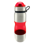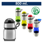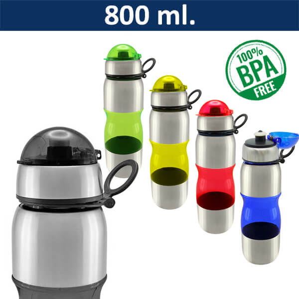 Caramayola de acero inoxidable SS201 y detalles plásticos en distintos colores. Tapa removible del mismo color de la botella. Capacidad de 800 ml. Presentación en bolsa plástica dentro de caja negra. Presentación en bolsa plástica. Incluye silicona antiderrame .Libre de BPA.