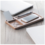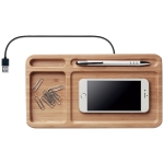 Placa escritorio de carga inalámbrica de bamboo. Carga celulares con tecnología QI. Presentación en caja de cartón color Kraft.