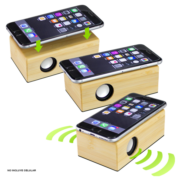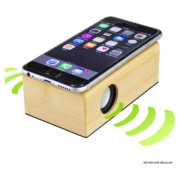 Parlante amplificador de sonido por Inducción, de madera de Bamboo. No necesita Bluetooth, Wi-Fi o conexión a cable. Amplifica el sonido una vez que se posa el celular sobre él, con un efecto de caja de resonancia. Compatible con cualquier modelo de teléfono celular. Contiene batería de ion-litio recargable incorporada. Incluye cable de sonido y cargador USB.