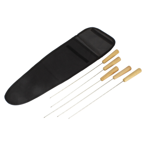 Set de 5 fierros para anticuchos con mango de madera, en estuche de tela raquelada. Fácil para bordar o imprimir. Tamaño: 47 x 19 cm (aprox).