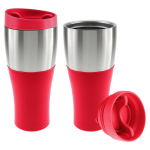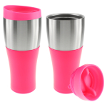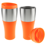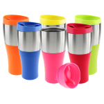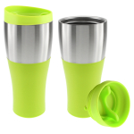 Coffee Mug grande de 470 ml plástico «PP-FRESH», tapa rosca y banda de Acero Inoxidable ideal para imprimir logos. Presentación en caja de cartón plateado.Ø 8.1 x 20.2 cm.