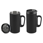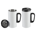 Mug Térmico Blanco de doble pared aislante, interior de acero inoxidable. Tapa, asa y base plástico negro. Cobertura exterior con polímero especial marca ORCA COATINGS(R) para una sublimación de primera calidad. Cada unidad se entrega dentro de su caja individual de cartón blanco.450 cc.
