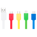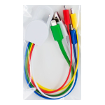 Connect Multicargador 5-en-1 con cables plásticos TPE engomado de colores y base plástica ABS blanco con mosquetón. Multi-cables con terminales de carga USB / Micro USB / Mini USB / iPhone / Type C. Compatible con dispositivos Android, Apple y Type C. Presentación en elegante bolsa OPP con orificio para colgador de ganchera. Producto con aprobación CE, ROHS, FC. 2.8 x 25 cm.