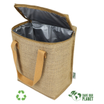 Bolso cooler con exterior de Yute e interior térmico aislante de PEVA y acolchado con esponja PE FOAM. En la tapa, sección superior del cooler, viene con una ventana cosida de eco-cuero, para aplicar logo de manera más elegante.24 x 30 x 14 cm.