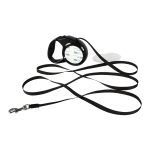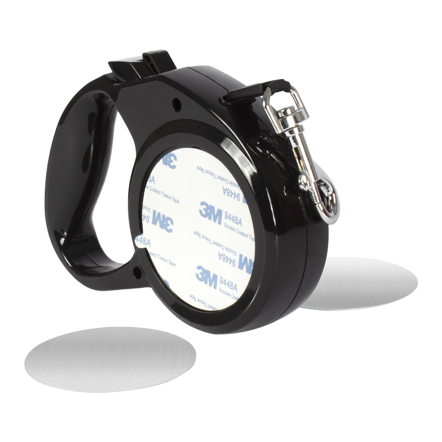 Correa extensible de 3mts para mascota, en plástico ABS negro, mosquetón de Acero inoxidable y correa de nylon color negro con sistema de traba. Contiene 2 compartimentos circulares y 2 placas metálicas blancas, para sublimar y pegar en ambos lados del producto. Tamaño: 15 x 11 x 3.3 cm.
