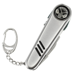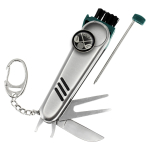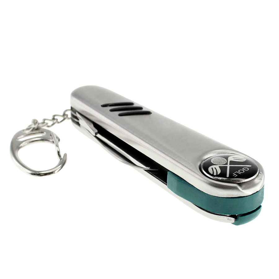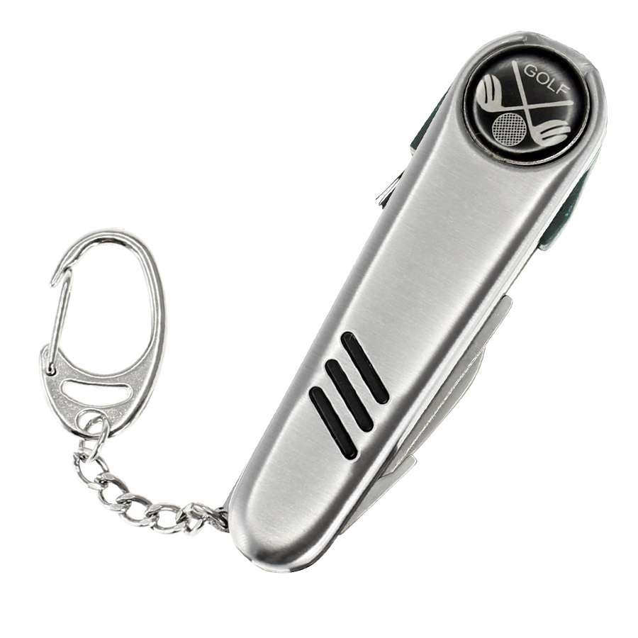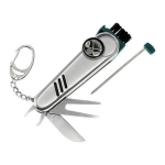 Cortaplumas de Golf de Acero Inoxidable con 7 funciones. Incluye Cuchillo, Levanta-Pique corto, Levanta-Pique largo, Cepillo, Bolígrafo tinta negra, Marcador magnético y llavero. Presentación en caja de regalo plateada. Tamaño: 9.2 x 2.6 x 1.5 cm. (cerrada).