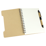 Cuaderno Ecológico con Tapas Duras de madera de Bamboo, 70 hojas interiores lineadas de papel kraft y anillado metálico doble cero. Incluye Bolígrafo Ecológico de madera de Bamboo con detalles negros. 13.5 x 18 x 1.3 cm. aprox.
