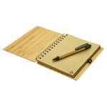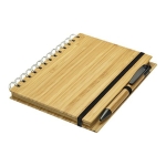 Cuaderno Ecológico con Tapas Duras de madera de Bamboo, 70 hojas interiores lineadas de papel kraft y anillado metálico doble cero. Incluye Bolígrafo Ecológico de madera de Bamboo con detalles negros. 13.5 x 18 x 1.3 cm. aprox.