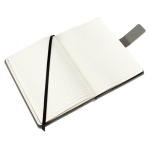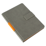 Cuaderno tamaño A5, con tapas duras forradas en PU gris, con cierre hebilla imantada, con 96 hojas amarillas lineadas de 80 gsm. Contiene detalles de color en lomo de hojas y porta-bolígrafo elasticado. Tamaño: 15 x 21 x 1.5 cm.