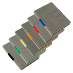 Libreta modelo "Colorskine" tamaño A6, con cubierta de cartón piedra forrada en PU simil cuero de color de 1.5mm de espesor. Interior 80 hojas lineadas amarillas de 80gsm. Incluye banda elástica y huincha separador de hojas al tono. Presentación individual en bolsa de polipropileno. 9 x 14.1 x 1.3 cm.