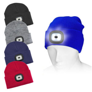 Gorro de Lana con linterna LED, 3 niveles de luz: Estroboscópica, Luz estándar, Luz potente.
