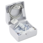 Kit de Carga y Audio. Contiene cargador USB para encendedor / toma de corriente del automóvil, auriculares blancos y multi-cable adaptador USB con 3 terminales para celulares y tablets. Un kit de emergencia indispensable. Presentación en caja plástica blanca.Tamaño: 6 x 5.7 x 4.4 cm.