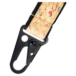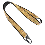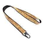 Fino lanyard porta-credencial de poliéster negro, emplacado en lámina de corcho con detalles de color. Terminación en robusto mosquetón metálico negro. Sugerencia de impresión serigrafia.