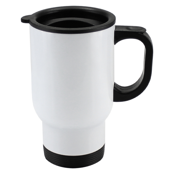 Mug Térmico Blanco de doble pared aislante, interior de acero inoxidable. Tapa, asa y base plástico negro. Cobertura exterior con polímero especial marca ORCA COATINGS(R) para una sublimación de primera calidad. Cada unidad se entrega dentro de su caja individual de cartón blanco.450 cc.