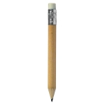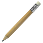 Lápiz grafito corto de madera barnizada. Cuerpo 100% cilíndrico, ideal para imprimir logos sin problemas. Incluye goma de borrar y viene con punta lista. Tamaño: 9 x Ø 0.8 cm.