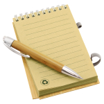 Libreta Ecológica con Tapas Duras de madera de Bamboo, 70 hojas interiores lineadas de papel kraft y anillado metálico doble cero. Incluye Bolígrafo Ecológico de madera de Bamboo con detalles plateados. 9 x 14 x 1.1 cm.