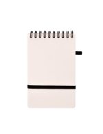 Libreta modelo "Whiteskine" tamaño A6, con cubierta de cartón piedra forrada en PU simil cuero blanco de 1.5mm de espesor. Interior 80 hojas limpias amarillas de 80gsm. Incluye banda elástica y huincha separador de hojas de color. Presentación individual en bolsa de polipropileno. 9 x 14.1 x 1.3 cm.