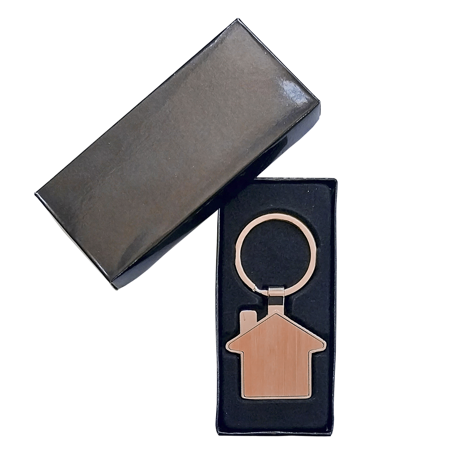 Llavero metálico con forma de casa de bamboo. Acabado brillante. Presentación en estuche de cartón laminado color negro con cuna interior de terciopelo.
