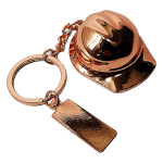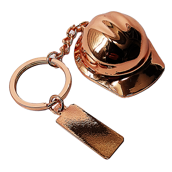 Llavero casco minero metálico electro plateado en color cobre. Incluye placa metálica para grabado. Presentación en estuche de cartón negra.