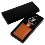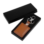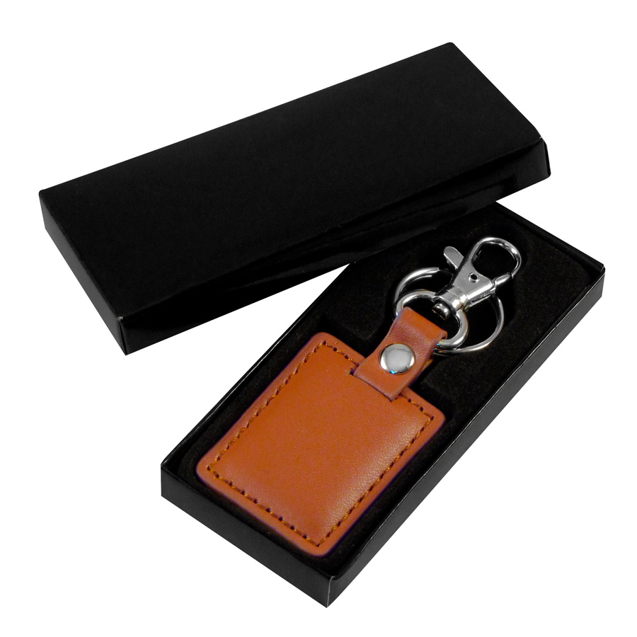 Llavero Metálico Rectangular. Presentación en estuche laminado negro con cuna aterciopelada. Tamaño: 1.9 x 4.8 x 0.5 cm.