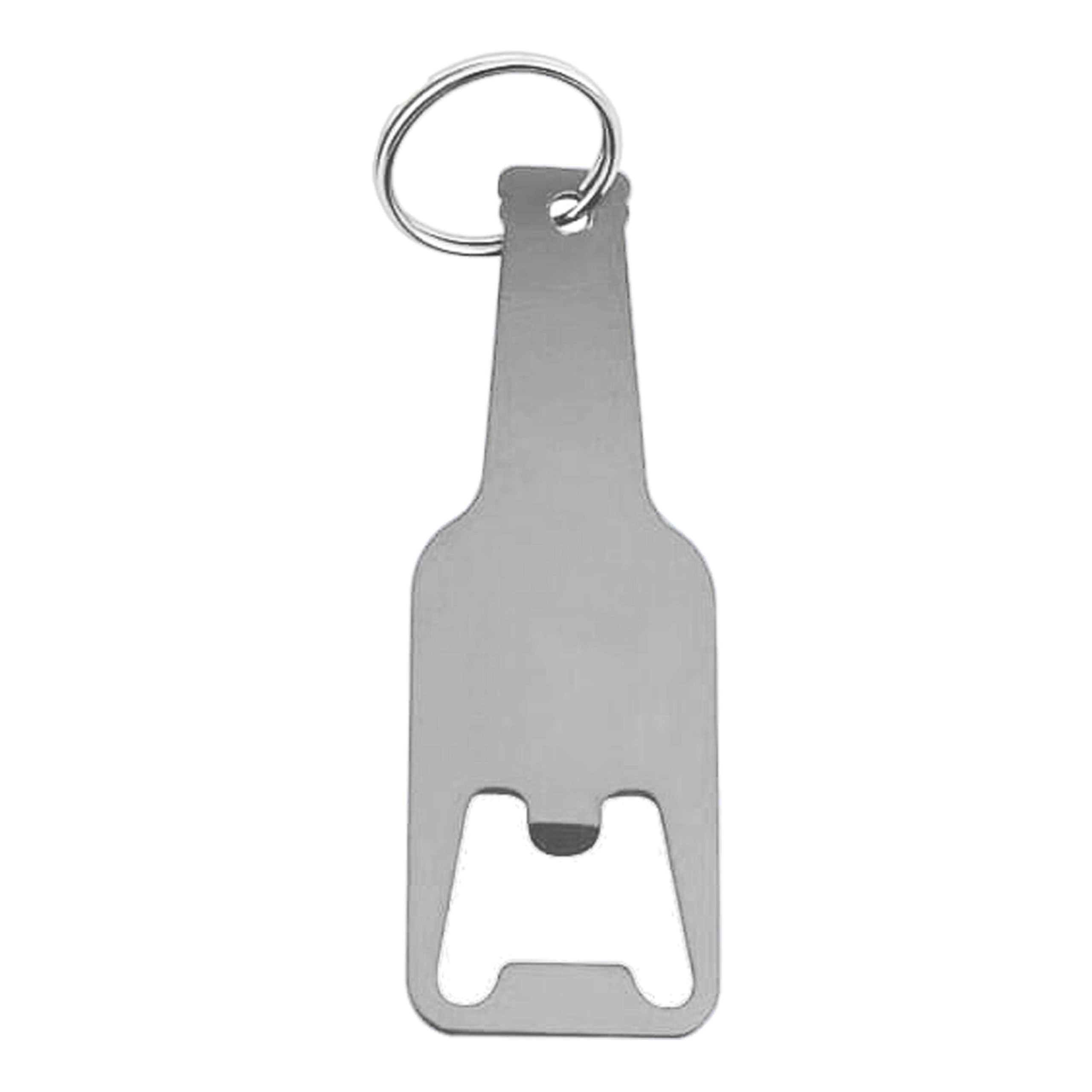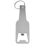 Llavero-Destapador con cuerpo plástico plateado y destapador metálico. Presentación en cajita plateada.