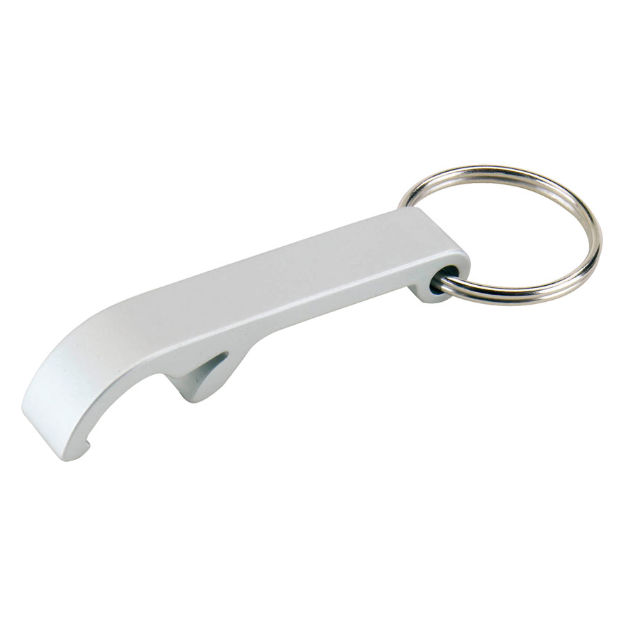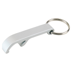 Llavero-Destapador con cuerpo plástico plateado y destapador metálico. Presentación en cajita plateada.