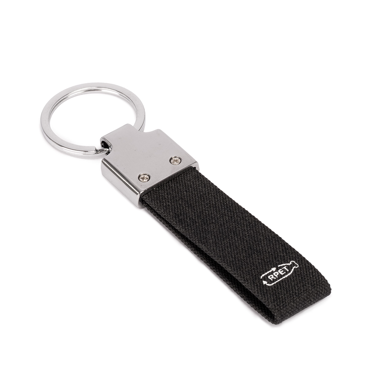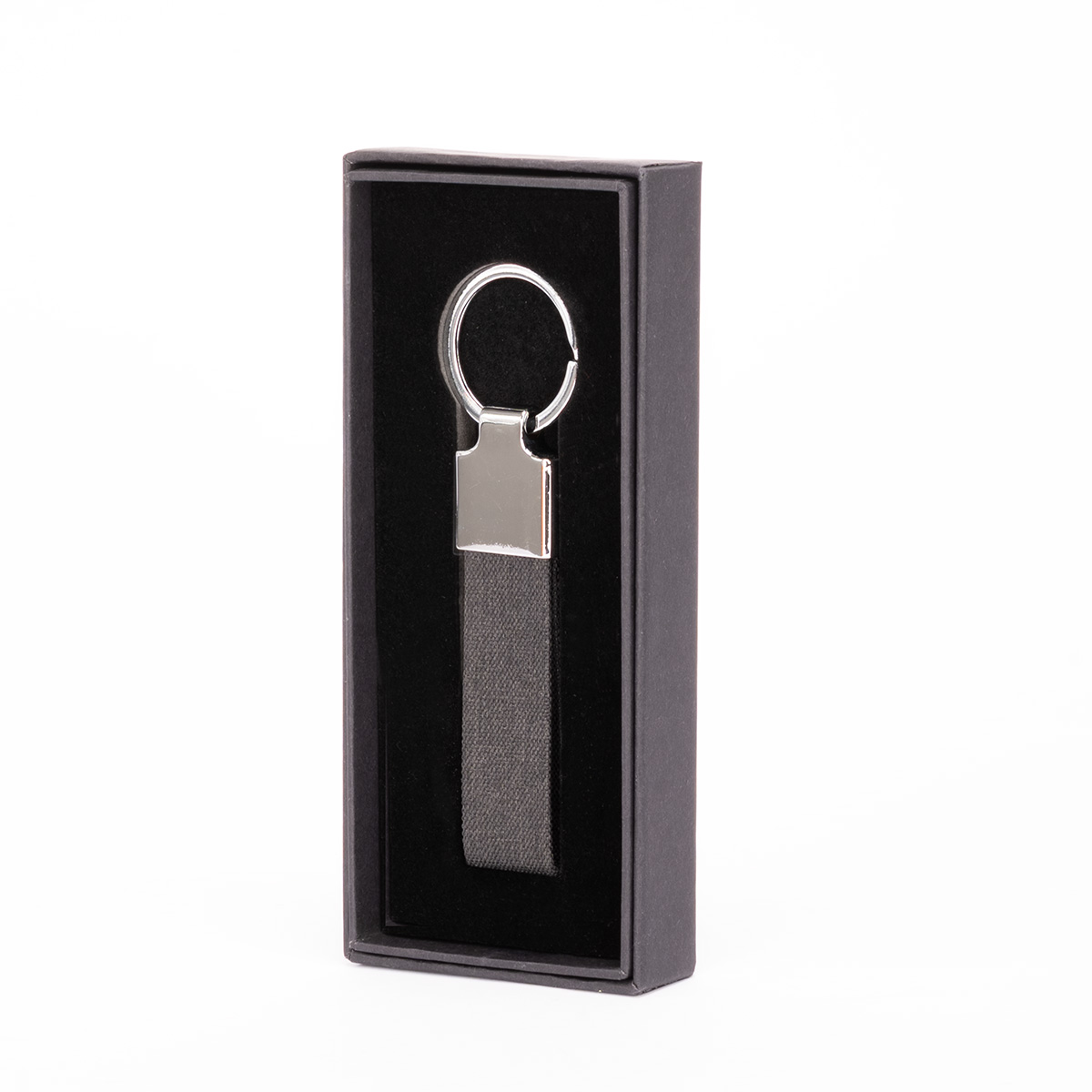 Llavero Metálico "Strap" con huincha de polyester de color. Presentación en estuche laminado negro con cuna aterciopelada. Tamaño: Estuche 11 x 5 x 1.2 cm / Placa Metálica 2.8 x 4 x 0.5 cm.