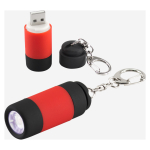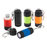 Llavero-Linterna LED con terminal USB para recarga (Batería recargable). Elegante cuerpo de silicona negro/color. Presentación en Estuche de Regalo plateado.Tamaño: Ø 2.1 x 5.3 cm.