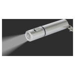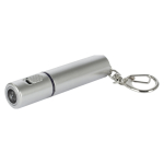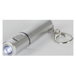 Llavero-Linterna LED plástica color plata. Usa 1 pila botón (incluida).