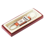 Llavero Metal-Cuero modelo “Premium”. Presentación en estuche laminado café con cuna aterciopelada. Tamaño: 2.8 x 7.2 x 1 cm.