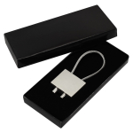 Llavero Metálico modelo «Candado». Presentación en estuche laminado negro con cuna aterciopelada.