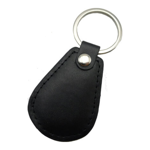 Llavero de Cuero Café con ventana rectangular metálica. Presentación en estuche laminado café con cuna aterciopelada. Tamaño: 5.2 x 3.2 x 0.4 cm.