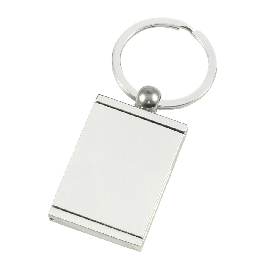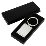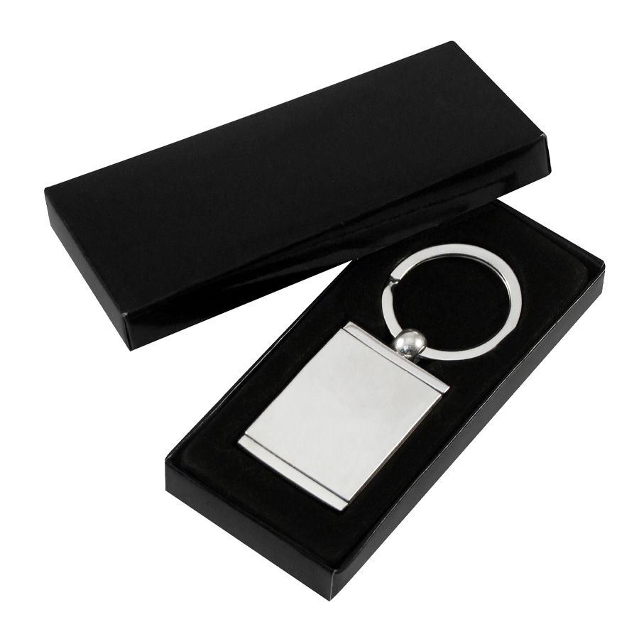 Llavero Metálico Rectangular. Presentación en estuche laminado negro con cuna aterciopelada. Tamaño: 1.9 x 4.8 x 0.5 cm.