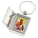 Llavero Metálico Porta-Foto. Presentación en estuche laminado negro con cuna aterciopelada. Tamaño: 3.1 x 4.4 x 0.6 cm.
