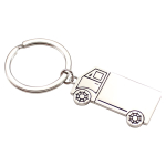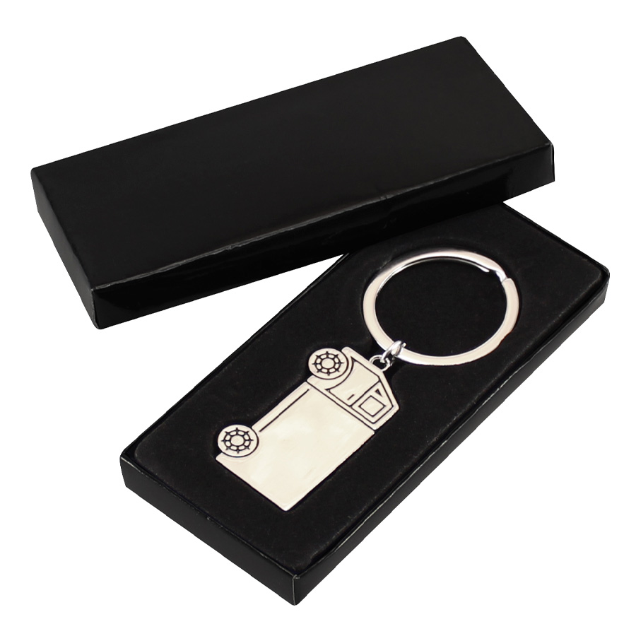 Llavero Metálico modelo «Truck», con forma de camión. Presentación en estuche laminado negro con cuna aterciopelada.4.3 x 2.4 x 0.3 cm.