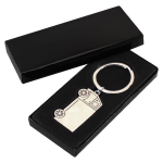 Llavero de símil Cuero Negro. Presentación en estuche laminado negro con cuna aterciopelada.6 × 4 × 0.5 cm.